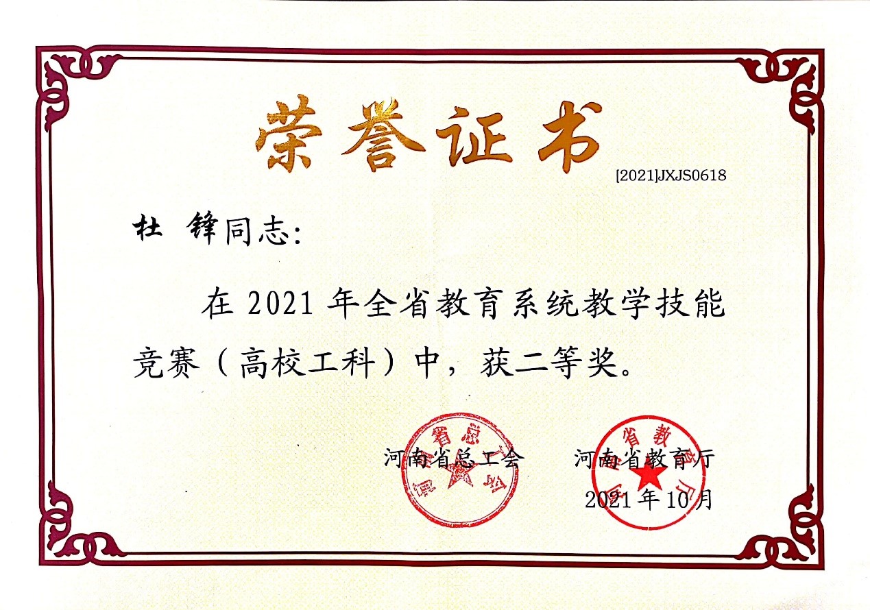 近日,河南省总工会、河南省教育厅公布了《关于表彰2021年全省教学技能竞赛获奖单位和个人的决定》,公司杜锋副教授、刘晓副教授在大学工科组中,分获二等奖和三等奖,这是公司在河南省教育系统教学技能竞赛中又一次获奖。