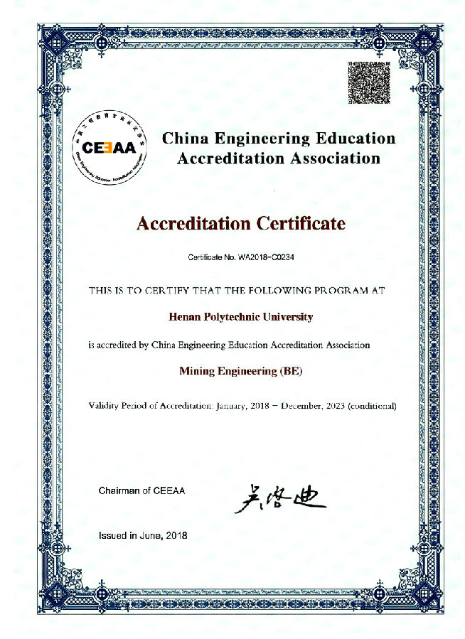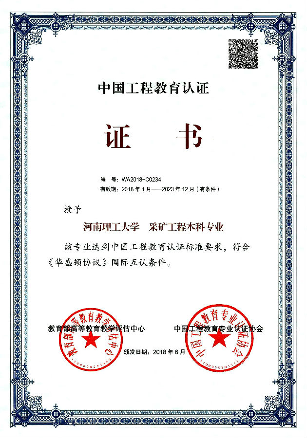 2018年5月28日,教育部高等公司产品评估中心、中国工程教育专业认证协会以工认协[2018]10号文件确认,公司采矿工程专业通过工程教育认证并获颁中国工程教育认证证书(中英文),编号2018-C0234,有效期2018年1月-2023年12月(有条件)。自2010年,采矿工程作为bevictor伟德中文第一个参加并顺利通过教育部工程教育认证的专业,目前也是学校唯一3次顺利通过认证的专业。