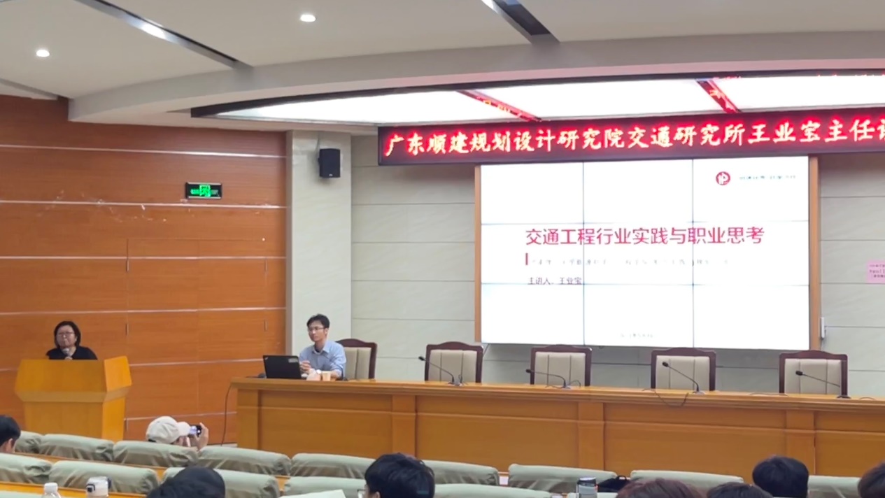 报告伊始,王业宝首先抛出交通工程“是什么?学什么?干什么?”三个问题并进行深入浅出的讲解,让在场交通学子对自己所学专业有了更为深刻的认知。王业宝凭借多年的工作经验以及身为面试官对求职者的要求,为在场学子介绍了交通工程培养目标和应该具备的相关能力。接着,王业宝从实践历程角度出发,分析了现阶段工作中的三种类型,即交通规划、交通研究、交通评价与设计,并以亲历者的身份回顾了几例方案设计推敲与高质量建设过程,深入进行重难点分析。最后他热情地与现场同学进行互动交流,倡导大家应该具备项目的逻辑思维,具备超前的职业思考。